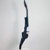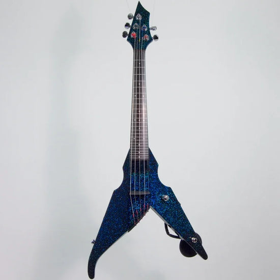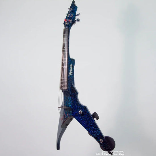 Here's a Viper that really catches the eye! This 5-string Kosmic Kamen Viper has phantom frets, giving you a visual cue to help with intonation in high volume situations, or any time when less-than-ideal monitoring makes it hard for you to hear your own sound. Its midnight blue and green Kosmic Kamen finish looks amazing in any light, and truly stunning in direct sunlight, or under bright stage lights. This finish is different from the Kamen Sparkle that we had before. The mica flakes that reflect back blue and green are layered onto the base color, using a method that causes only the blue flakes to sparkle from certain angles. The visual effect is almost hypnotic. Chrome hardware completes the look of this beautiful Viper. A Barbera Twin Hybrid transducer bridge gives the Viper a full, rich tone. It sounds great "clean" through a good acoustic amplifier, but is perhaps the best pickup on the market for players who are using high-gain effects to achieve electric guitar-like sounds. Its strong output signal will help you to be heard, even when playing with the loudest ensembles. The Viper's patented chest support system is a stroke of genius -- you don't have to waste even the tiniest bit of effort or attention to holding up the instrument. This gives you the freedom to focus all of your energy on making music. The chest support system lets you easily move around on stage, step up to the mic, or whatever you need to do -- and the instrument sounds as good as it looks. Break free of your traditional thought patterns, and take your playing to the edge! Comes with fitted, padded gig bag. For extra protection, we recommend a customer Viper hard case.